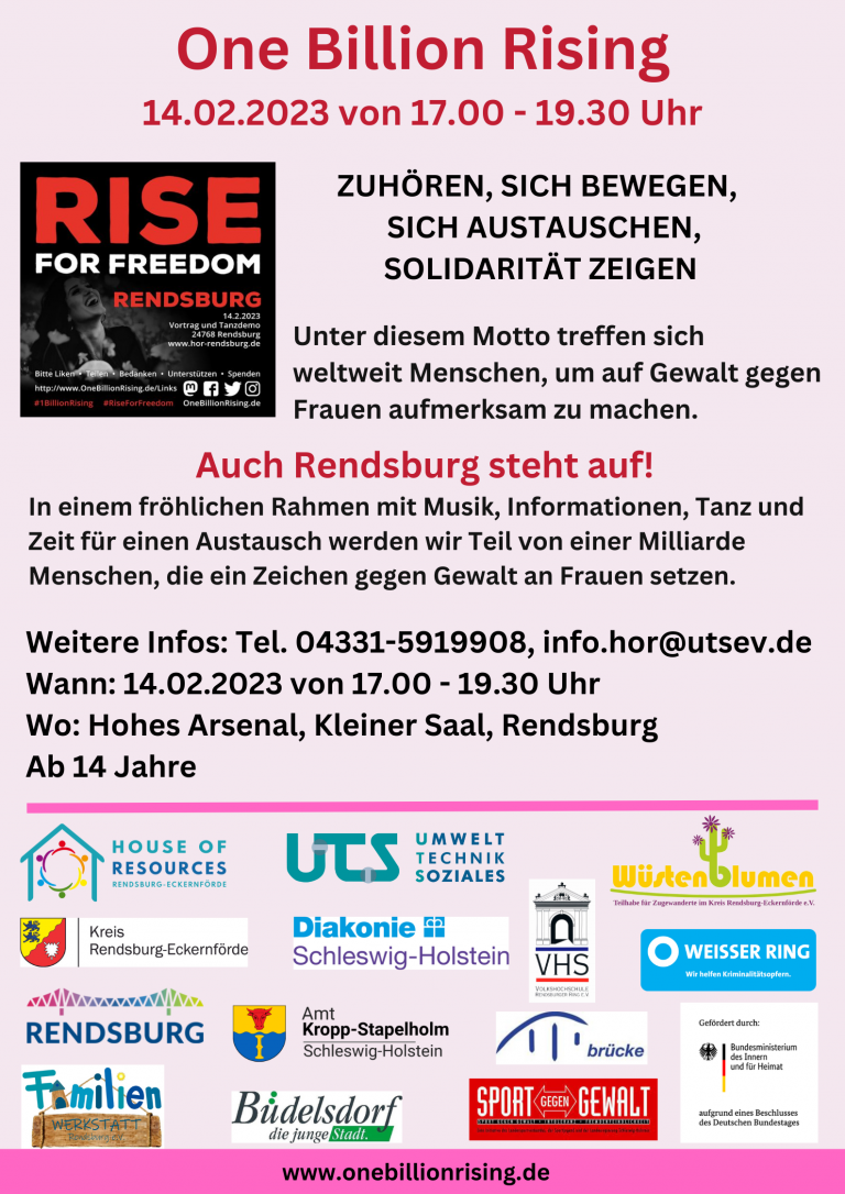 Lesen →One Billion Rising - Rendsburg steht auf 14.02.2023 von 17.00 - 19.30 Uhr. One Billion Rising - unter diesem Motto treffen sich weltweit jeweils am 14. Februar Menschen, um auf Gewalt gegen Frauen aufmerksam zu machen. Auch wir wollen dabei sein. In einem fröhlichen Rahmen mit Musik, Informationen, Tanz und…