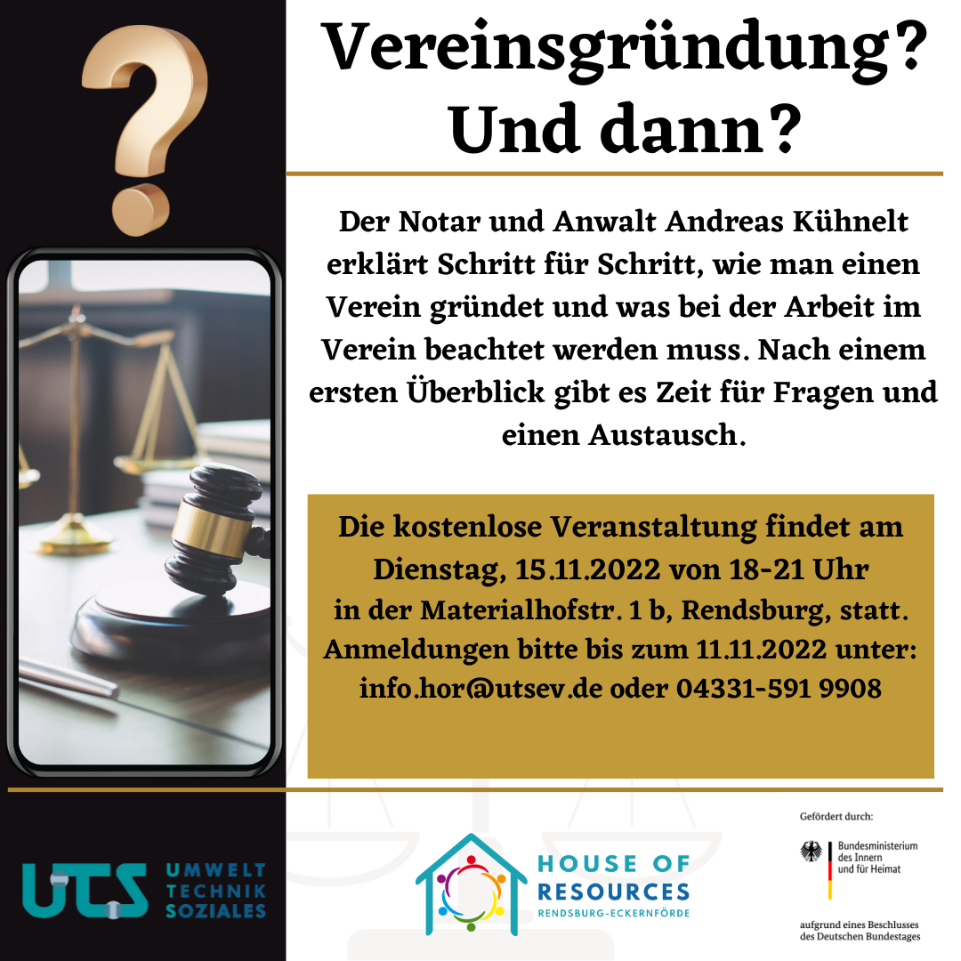 Begleiten Sie uns in unserer kostenlosen Fortbildung auf einen Rundgang durch das Vereinsrecht. Der Rechtsanwalt und Notar Andreas Kühnelt gibt Informationen zu: – Wesen des Vereins- Gründung eines Vereins – Die Gemeinnützigkeit- Organe- Mitgliederversammlung- Mitgliedschaft- Vorstand- Haftung des Vorstandes- Beirat- Datenschutz im Verein Dazu könnten Sie eure Fragen stellen. Die Fortbildung findet am Dienstag, 15.11.2022, von 18.00 bis 21.00 Uhr im House of Resources, Materialhofstr. 1b, 24768 Rendsburg, 1. Etage statt. Anmeldungen bitte unter info.hor@utsev.de