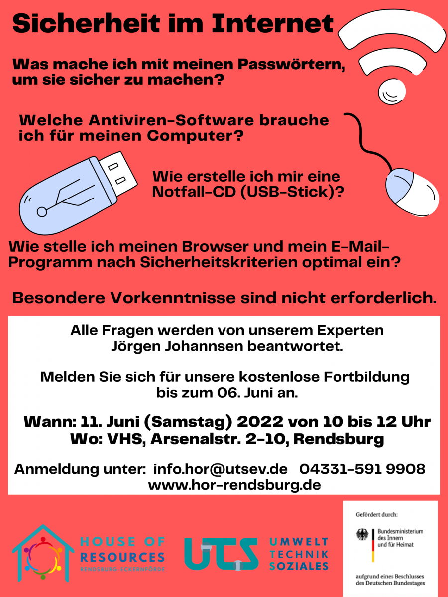 Computer und persönliche Daten schützen – in unserem KOSTENLOSEN Workshop am 11. Juni 2022 lernt ihr mit praktischen Übungen einfache Tricks, um sicher im Internet zu surfen und online zu arbeiten. Auch für Anfänger! Anmeldung unter info.hor@utsev.de oder 04331-5919908